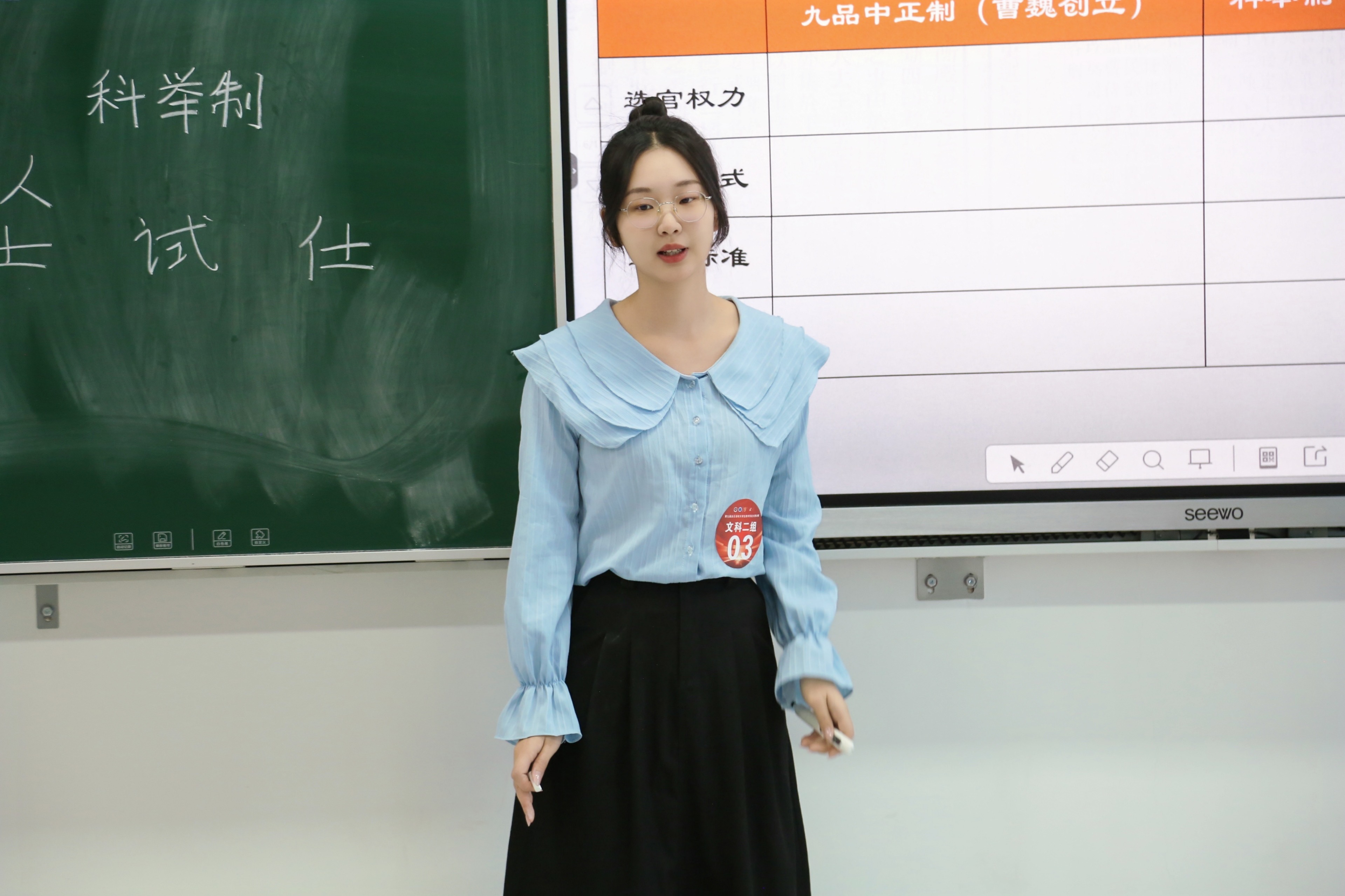 唐茂翼同学在比赛中展现了深厚的历史专业功底与出色的教学技能。她秉持“用教材教而非教教材”的理念,深度挖掘隋唐制度变革中的历史逻辑,重构教学内容。以清晰的主线串联制度创新与社会发展,通过互动提问、史料分析激发员工思维,课堂氛围生动且富有启发性,充分体现了新课标下的教学创新。课程思政方面:合理融入“制度创新推动国家发展”的价值导向,实现知识传授与价值引领的有机统一。