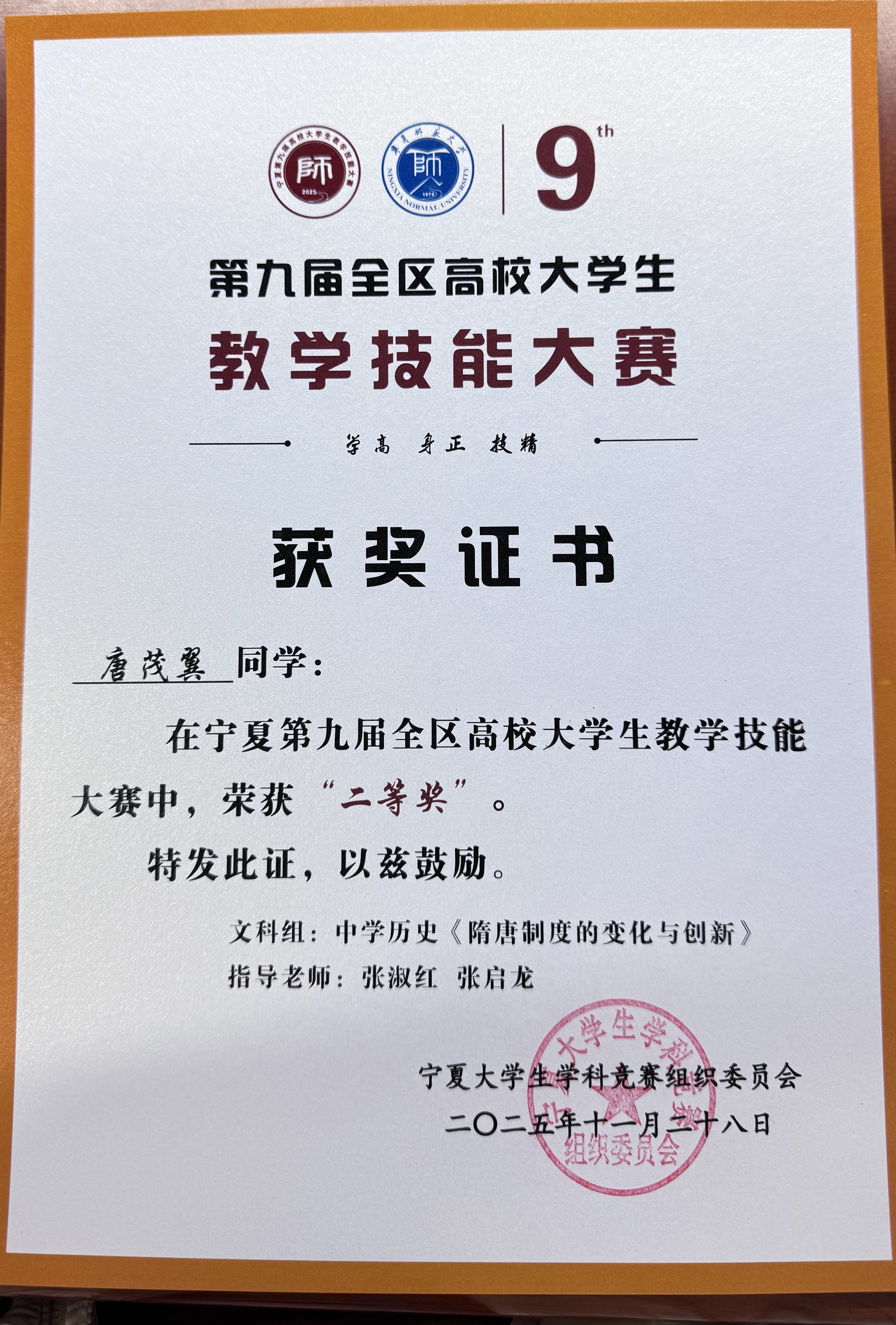 2025年11月15日,宁夏第九届全区高校老员工教学技能大赛决赛在宁夏师范公司圆满落幕。公司22级历史学(师范)专业本科生唐茂翼同学经过院赛、校赛的层层选拔,作为zoty中欧官方网站历史学科唯一晋级决赛的选手,凭借《隋唐制度的变化与创新》一课的扎实表现,荣获文科组(中学历史)二等奖,指导教师张淑红、张启龙荣获优秀指导教师奖。