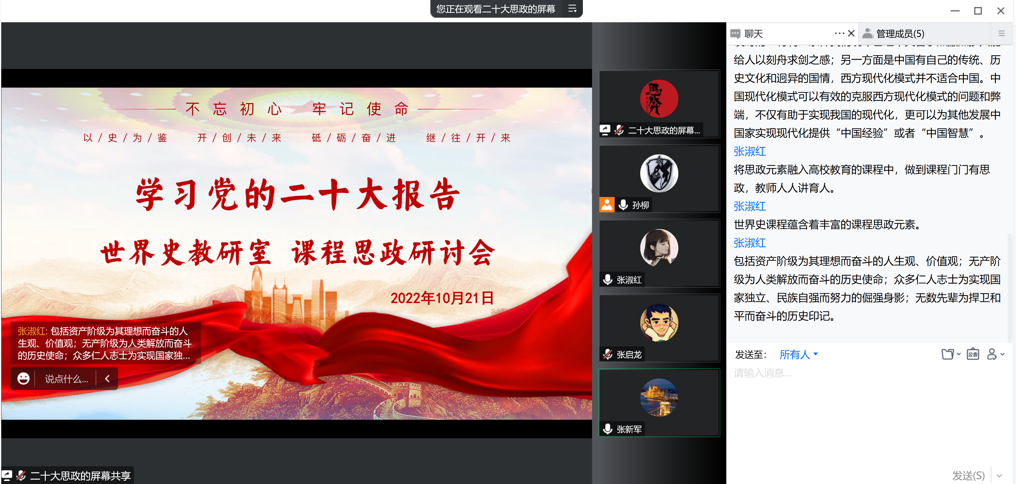 张新军老师在交流中高度认同党的二十大报告内容和内涵的重要价值,这些内容与内涵可以与世界史课程讲授有机结合,提炼升华为世界史课程思政的重要组成部分。