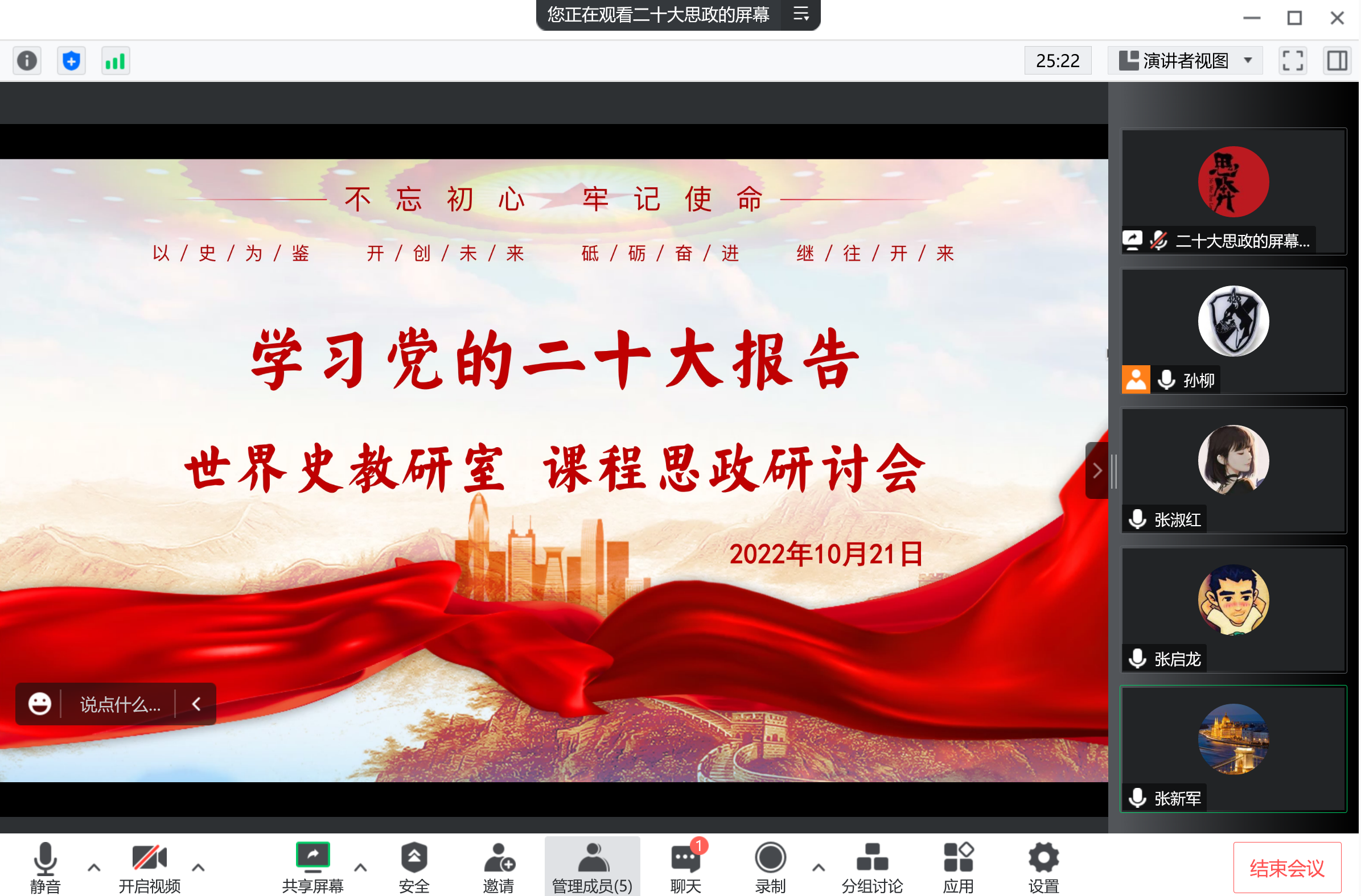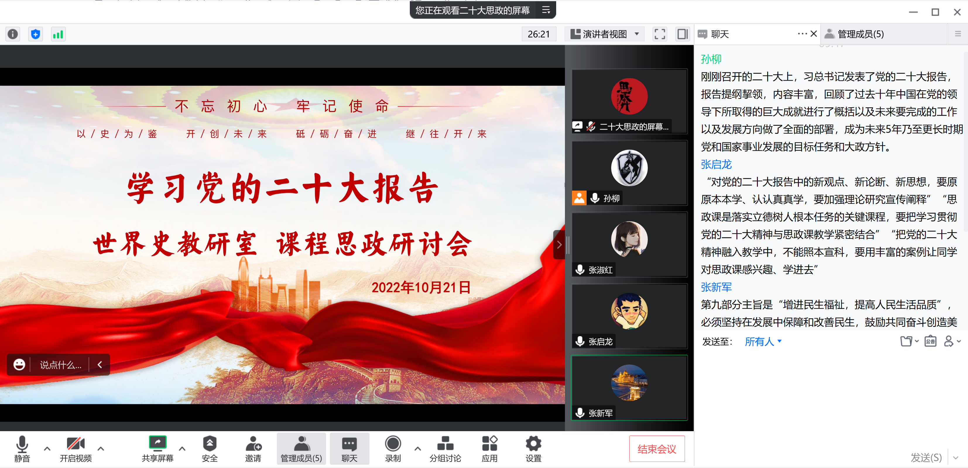 在中国共产党第二十次全国代表大会召开之际,zoty中欧历史系世界史教研室于10月21日上午进行“党的二十大报告与世界史课程思政”专题研讨会,教研室教师就党的二十大报告内容、精髓与世界史课程思政之间的关系在腾讯会议进行了深入探讨。