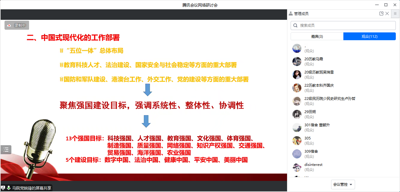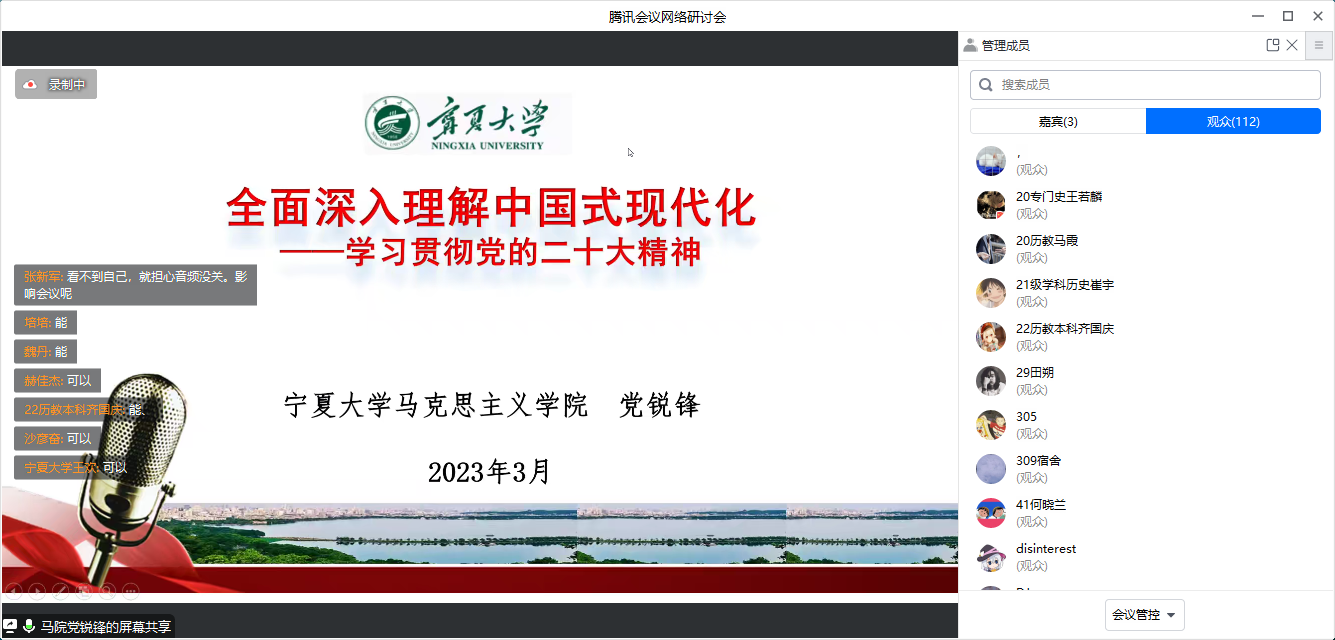 党锐锋教授紧紧围绕学习宣传贯彻党的二十大精神,以《全面深入理解中国式现代化——学习贯彻党的二十大精神》为题,他从“中国式现代化的中国特色与本质要求”、“中国式现代化的工作部署”和“现代化强国之路,必须牢牢把握的重大原则”三个方面阐述了实现中国式现代化的意义。最后,他引用二十大报告中的话语与大家共勉“全党同志务必不忘初心、牢记使命,务必谦虚谨慎、艰苦奋斗,务必敢于斗争、善于斗争,坚定历史自信,增强历史主动,谱写新时代中国特色社会主义更加绚丽的华章”。宣讲内容紧扣主题,内涵丰富,对深刻理解、准确把握和深入贯彻落实党的二十大精神有较大的启发和帮助。