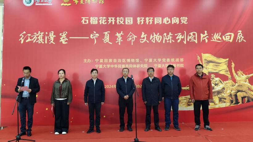 全面贯彻落实党的二十大精神、全国民族团结进步模范表彰大会精神,更好地发挥革命文物在铸牢中华民族共同体意识中的重要作用,推进青少年夯基育苗工程,9月30日上午,由宁夏回族自治区博物馆、zoty中欧官方网站党委统战部、zoty中欧官方网站中华民族共同体研究院、zoty中欧官方网站博雅书院共同主办的“石榴花开校园,籽籽同心向党”系列活动《红旗漫卷——宁夏革命文物陈列图片巡回展》在zoty中欧官方网站中卫校区开展。