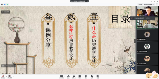 首先,吴老师向同学们分享了自己八年来的教学经验。老师提到作为一名一线的历史教学老师,最主要的是上课,那如何上好一堂好课,她认为“一堂好课不是上出来的,而是设计出来、备出来的”。吴老师在自己的教学过程中,通过精巧的教学设计,带动员工加入到课堂中来,最终可以达到好的效果。本次分享中,老师主要通过三个方面来进行,即“什么是历史教学设计,”“怎样进行历史教学设计”以及“课例分享”。