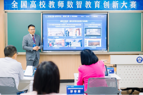 在现场汇报环节,邓文韬副教授代表《解读西夏》课程团队,结合公司办学定位,课程特色与学情概况,介绍了课程通识化转型,线上线下混合式教学,虚拟仿真技术融入与知识图谱、数字资源库建设概况及其育人功能、成效,展现了数智技术赋能通识课程建设,培养“四新”人才的路径。最终以优异成绩位列本组第一名,荣获赛事特等奖。