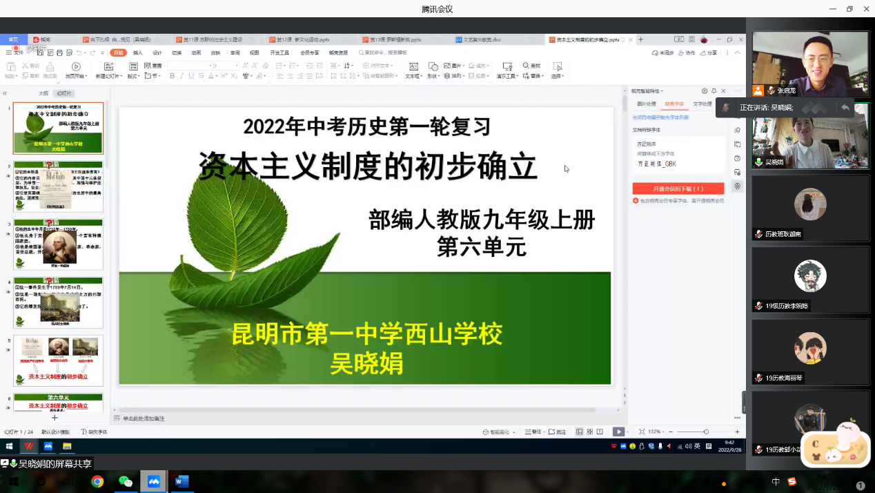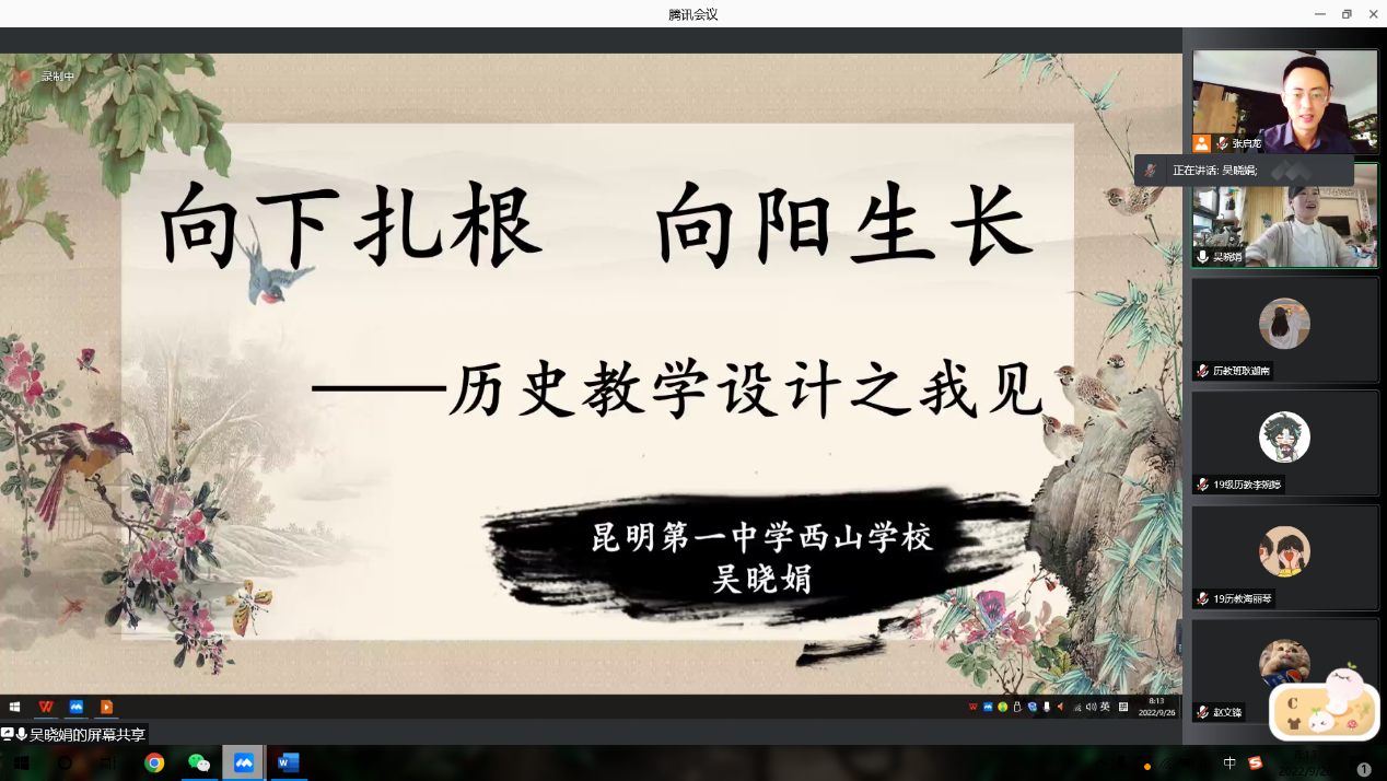 为了推动历史师范专业认证的深入开展,提高公司师范教育的水平与质量,促进大中学师范教育一体化建设,zoty中欧于2022年9月26日上午进行了“历史名师面对面”系列讲座第五讲。部分历史学(师范)本科生和学科教学(历史)全体研究生,参与了线上腾讯讲座。本次讲座邀请了云南昆明第一中学西山公司教学名师吴晓娟主讲,主题为“向下扎根,向阳生长——历史教学设计之我见”,活动由历史系副主任张启龙老师主持。