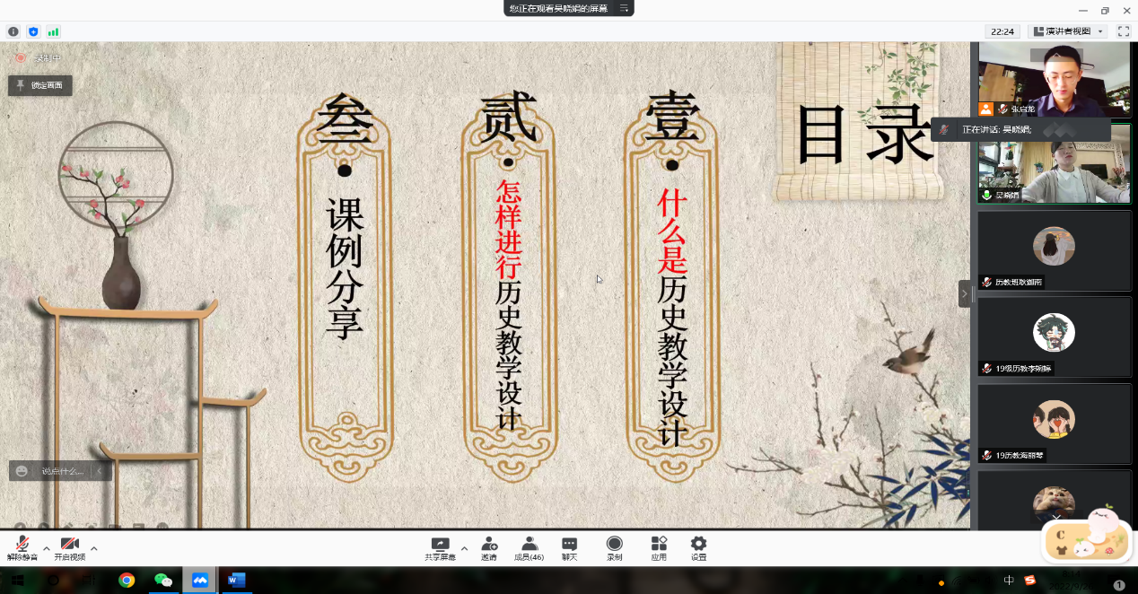 首先,吴老师向同学们分享了自己八年来的教学经验。老师提到作为一名一线的历史教学老师,最主要的是上课,那如何上好一堂好课,她认为“一堂好课不是上出来的,而是设计出来、备出来的”。吴老师在自己的教学过程中,通过精巧的教学设计,带动员工加入到课堂中来,最终可以达到好的效果。本次分享中,老师主要通过三个方面来进行,即“什么是历史教学设计,”“怎样进行历史教学设计”以及“课例分享”。